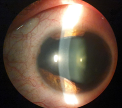 Figura 1. Segmento anterior del OI con córnea transparente, imagen de cobre martillado en el endotelio, pupila corectópica, atrofia del iris difusa y ectropión uveal.