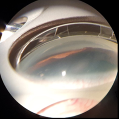 Figura 2. Gonisocopía en OI con presencia de sinequias anteriores periféricas altas y de base ancha que se insertan a nivel de malla trabecular y línea de Schwalbe con cierre angular secundario.