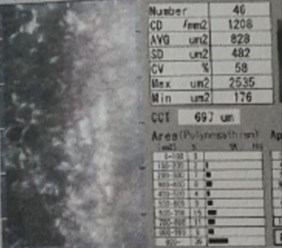 Figura 3. Microscopía especular de OI. Se observa disminución en el recuento de células endoteliales con polimegatismo y pleomorfismo asociado y aumento del espesor corneal.