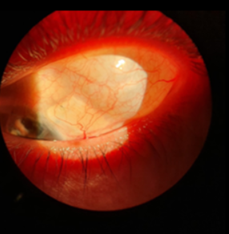Figura 4. Implante de válvula de Ahmed en OI. Se observa tubo en cámara anterior, ampolla formada, elevada y difusa.