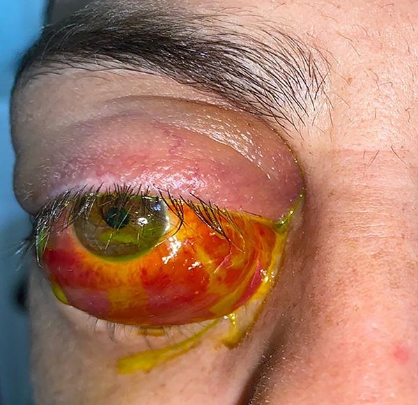 A la biomicroscopía (BMC) del OD se observó quemosis hemorrágica e inyección conjuntival 360 grados, úlcera corneal inferior y BUT disminuido.