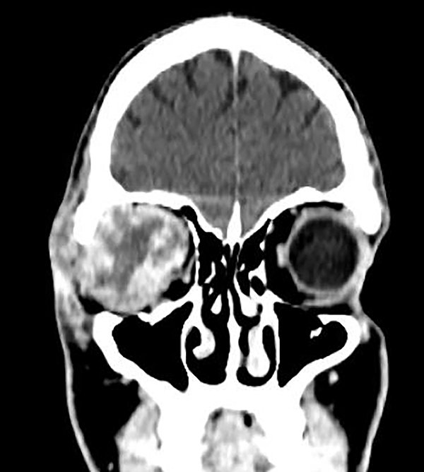 La tomografía computada (TC) de órbita derecha informó: formación heterogénea con efecto de masa sobre las estructuras adyacentes (musculares y nerviosas) de 40 mm asociada a proptosis del globo ocular homolateral (fig. 2).