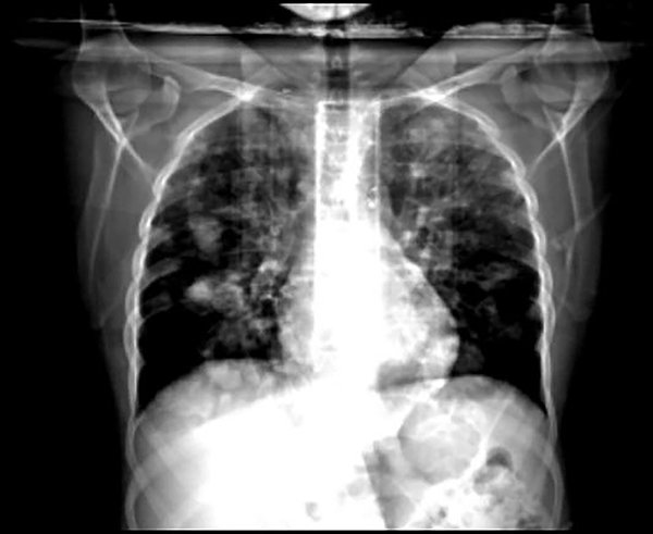 Figura 3. TC de tórax: múltiples nódulos pulmonares con derrame pleural bilateral.