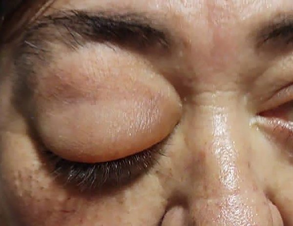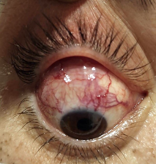 Figura 1. Órbita congelada derecha con quemosis hemorrágica y lagoftalmos.