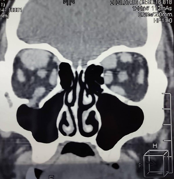 Figura 2. TC de órbita: corte coronal con aumento de la densidad de partes blandas orbitarias derechas (músculos y nervios).