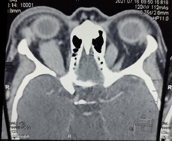A la inspección se observó una masa palpable en el reborde orbitario superior y nasal derecho, palpable, dolorosa, adherida a planos profundos, de consistencia dura y pétrea, con presencia de edema y eritema palpebral, sin desplazamiento del globo ocular. Los movimientos oculares se encontraban limitados en la mirada hacia adentro, arriba y abajo. A la BMC presentaba leve congestión conjuntival en OD; una presión intraocular de 15 mmHg (AO), reflejo fotomotor conservado (AO).