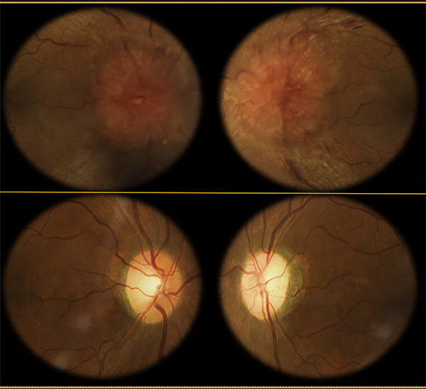 Al examen oftalmológico se constató una agudeza visual mejor corregida de 9/10 en ambos ojos. Visión cromática, test de Amsler, biomicroscopía, presión intraocular y movimientos oculares sin particularidades. Se detectó un leve escape pupilar bilateral.