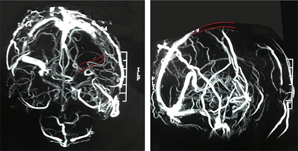 Figura 2. Angio-RNM venosa poscontraste donde se observa: a) defecto de relleno seno sigmoideo izquierdo, b) defecto de relleno en tercio medio de seno longitudinal superior.