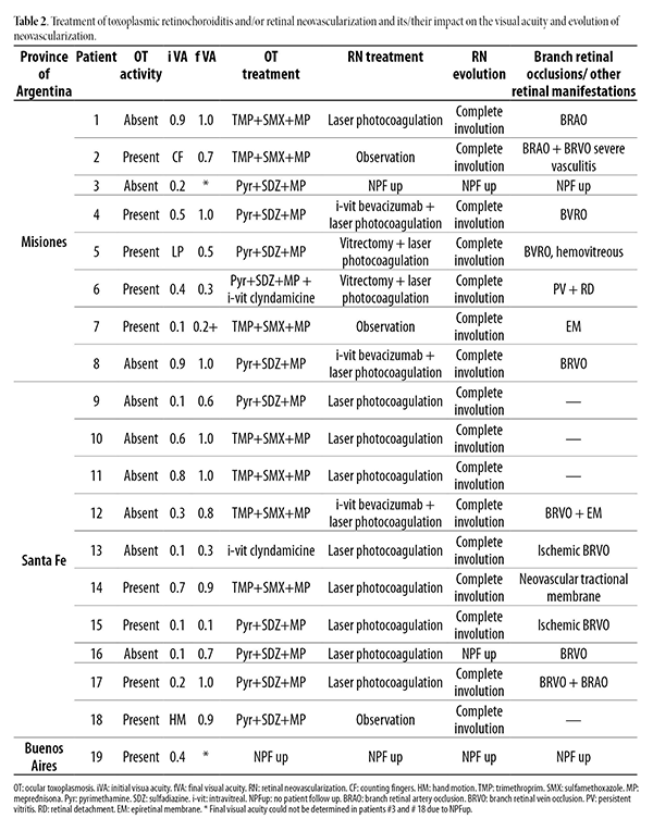 Methods: A retrospective study was performed, reviewing clinical records of patients with diagnosis of OT from four tertiary referral uveitis centers, distributed in 3 different regions of Argentina. Collected data included best corrected visual acuity at presentation and that corresponding to the last examination, retinal location and extension of the toxoplasmic lesion and that of the retinal neovessels, treatment of the retinal neovascularization and retinal complications.