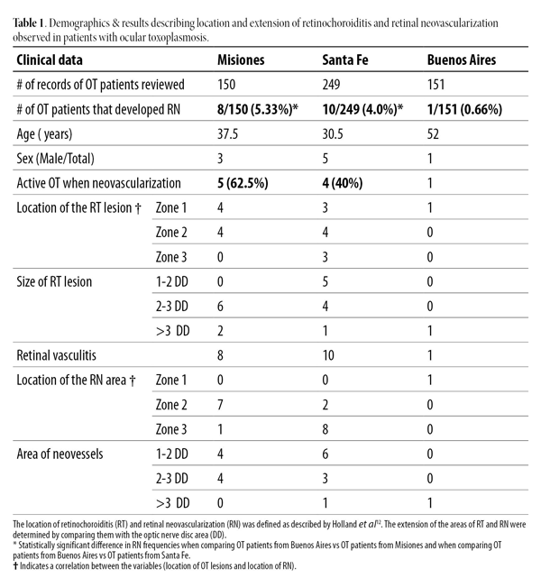 Resultados: Foram revisados 550 prontuários de pacientes com toxoplasmose ocular e incluídos 19 pacientes que desenvolveram neovascularização retiniana. A frequência de NR em pacientes com TO na Argentina foi de 3,16%. O desenvolvimento de NR foi maior em pacientes com TO da província de Misiones (5,33%) e foi quase inobservável em pacientes com TO da província de Buenos Aires (0,66%) (p=0,018). Pacientes com TO de Misiones desenvolveram NR na zona retiniana 2, enquanto a NR observado em pacientes com TO de Santa Fé teve distribuição mais periférica (p=0,016). A fotocoagulação a laser foi o tratamento mais utilizado para RN em pacientes com TO. O uso de bevacizumabe intravítreo como tratamento inicial do RN não alcançou involução completa dos vasos retinianos.