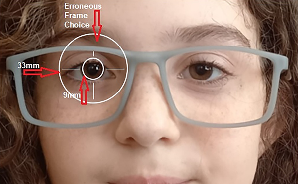 If an inappropriate frame is selected, the 33.0 mm treatment area may not be completely enclosed within the frame. This misalignment can lead to uneven distribution of the optical treatment, possibly reducing its effectiveness in controlling myopia progression. This misalignment compromises the therapeutic benefit, potentially resulting in suboptimal control of myopia progression. An incorrect frame choice can also cause visual discomfort and strain. If the distance zones are not correctly centered, it may lead to issues such as blurred vision, double vision, or difficulty in focusing, which can cause discomfort for the wearer.