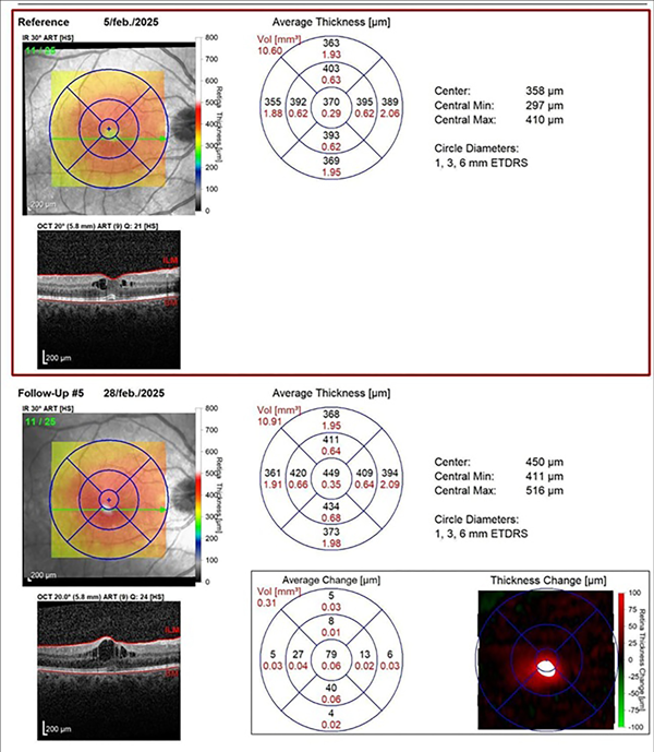 Figuras 3 y 4. OCT del ojo derecho luego de cuatro meses de tratamiento. Se aprecia el aumento del espesor macular en pocas semanas.