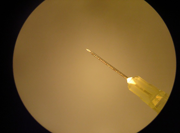 En condiciones de asepsia y antisepsia, en quirófano, bajo microscopio óptico, campo estéril, iodopovidona 5% previa, anestesia tópica y separador de párpado estéril, mediante un dispositivo personalizado —preparado con una aguja 30G y una camisa de acero quirúrgico que sirve para tener un tope y así exponer 1,2 milímetros de la aguja para acceder de forma segura al espacio supracoroideo—, se inyectaron 0,1 mililitros de acetato de triamcinolona a 4 mm de limbo (fig. 5), utilizando de este modo la técnica de dos manos, inyección lenta, de presión continua y perpendicular ya descrita por otros autores3-4. Inmediatamente se constató un vítreo sin presencia de medicación y sin triamcinolona subconjuntival.