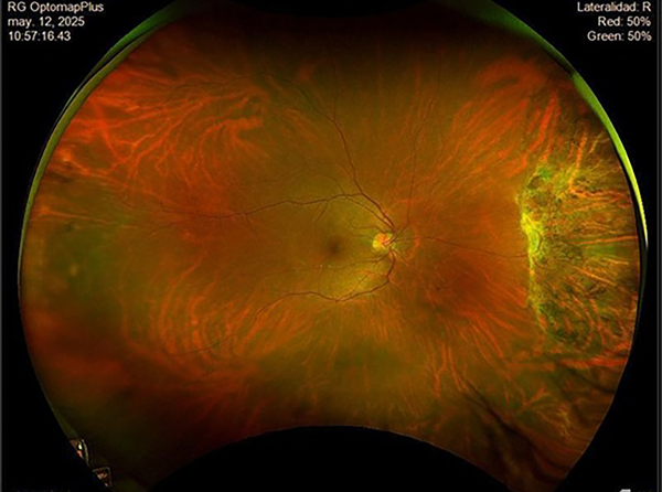 Figura 1. Fundoscopía del ojo derecho bajo tratamiento con valganciclovir vía oral.