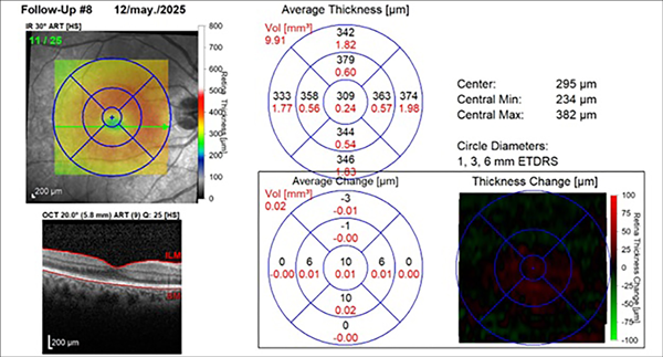 A las 48 horas se realizó nuevamente una OCT macular que demostró una reducción drástica en el edema macular central, acompañado de mejoría en la agudeza visual de la paciente a 20/20 OD (fig. 6). Se adjunta retinografía de campo amplio de la última visita de control de la paciente donde también se aprecia la disminución de la vitreítis previa (fig. 7). La paciente se mantuvo estable en los siguientes tres meses de seguimiento con una PIO de 17 mmHg con la última OCT en 309 µm de espesor central macular (fig. 8).