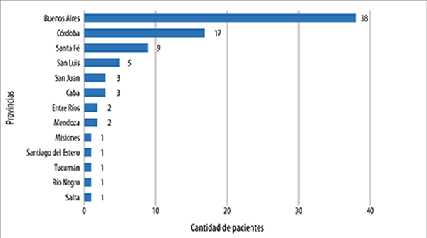Del análisis de la distribución de la población en el territorio argentino, se destacó una mayor concentración de casos en la provincia de Buenos Aires (n=38), seguida por Córdoba (n=17), Santa Fe (n=9) y San Luis (n=5) (fig. 1). También se reportaron casos en CABA, San Juan, Mendoza, Misiones, Entre Ríos, Río Negro, Tucumán y Salta, entre otras jurisdicciones.