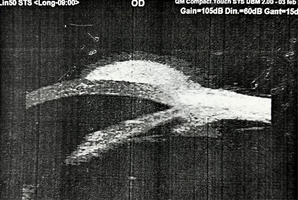 Se solicita ultrabiomicroscopía (UBM) de urgencia la cual informa: OD: lesión sólida en sector nasal superior en conjuntiva limbar que avanza sobre la córnea e impresiona delaminar en la región limbar, no se distingue límite con los tejidos subyacentes. Mide 1,80 mm de altura y de base 5,88 mm (longitudinal) por 7,80 mm (transversal) (fig. 2).