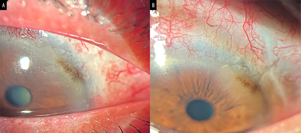 Figura 3. Aspecto biomicroscópico postoperatorio luego de la extirpación de la lesión (A) que se observa con mayor aumento en (B) donde se ve un remanente de pigmento en el limbo.