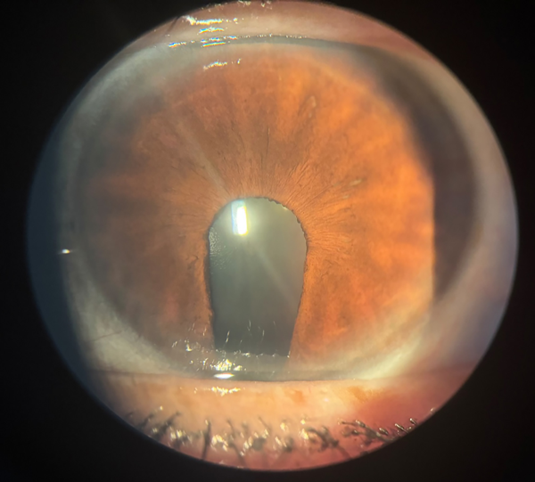 Esta imagen biomicroscópica corresponde al caso de una mujer de 53 años con coloboma de iris unilateral, inferior y completo, sin otras alteraciones oculares asociadas. El coloboma corresponde a una malformación congénita derivada del cierre incompleto de la fisura embrionaria1, que en este caso se manifiesta de manera aislada, sin compromiso coriorretinal ni del nervio óptico. La imagen ilustra con claridad el defecto pupilar en forma de hendidura localizado en el cuadrante inferonasal, típico de esta anomalía.