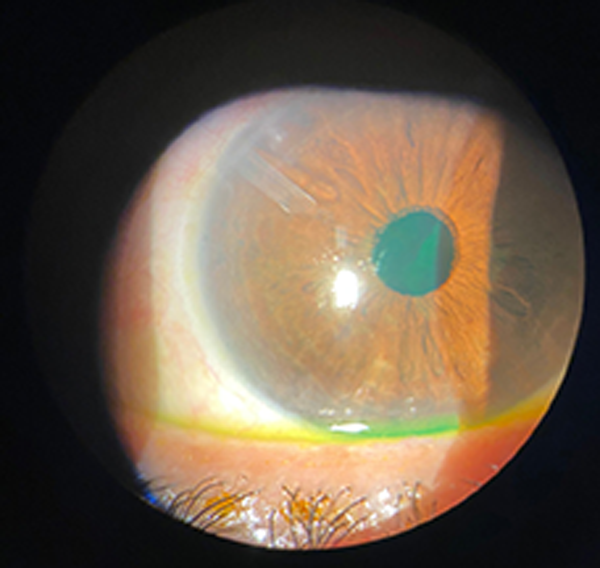 A patient with a history of keratoplasty in 2017 (OD) and 1999 (OS) for keratoconus underwent phacoemulsification with IOL implantation in the right eye on December 19, 2019. Immediate postoperative BCVA was light perception (LP). At 30 days, the right eye showed graft edema, Tyndall, inflammatory membrane, and a 3 mm hypopyon. Anterior chamber lavage with amphotericin, amikacin, and vancomycin was performed with culture sampling. Post-operative progress was satisfactory. On day 2 post-surgery, yag laser was performed in the RE with 16 shots of 1.3 mj breaking the pre-lenticular inflammatory membrane. Initial improvement was noted, though VA remained LP. Day 7 post-surgery, the IOP was 39 mmHg. On January 28, 2020, a silicone tube was implanted in the superonasal anterior chamber. The postoperative course was stable, without recurrent infection. At last follow-up, VA was LP, with diffuse graft opacity and tube in correct position.