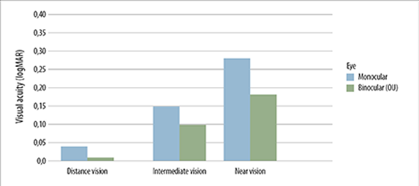 Figure 2. Uncorrected monocular and binocular visual acuity one month after surgery. Mean logMAR visual acuity values for distance, intermediate (66 cm), and near (33 cm) vision are presented in patients implanted with the Magnificent intraocular lens.