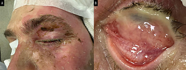 Figura 1. (A) Lesión facial y ocular al ingreso. Se evidencia eritema, necrosis y costras en el párpado superior y región periorbitaria con imposibilidad de evaluar estructuras internas por simbléfaron y edema conjuntival. (B) Detalle del ojo izquierdo al ingreso. Opacidad conjuntival completa, hiperemia intensa y presencia de simbléfaron severo que impedía la evaluación corneal.