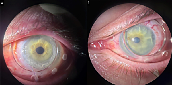 Figura 2. (A) Control postoperatorio a las 24 horas. Se observa lente de Illig correctamente suturada, membrana amniótica plegada sobre la superficie ocular, cámara anterior formada y signos de mejoría inflamatoria. (B) Imagen al séptimo día postoperatorio. Se aprecia lente de Illig estable, vascularización limbar en evolución y persistencia de opacidad corneal central. El paciente refiere leve mejoría visual.