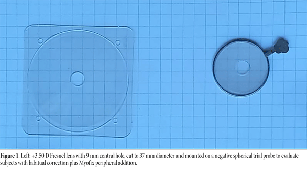Figure 1. Left: +3.50 D Fresnel lens with 9 mm central hole, cut to 37 mm diameter and mounted on a negative spherical trial probe to evaluate subjects with habitual correction plus Myofix peripheral addition.