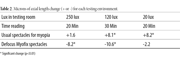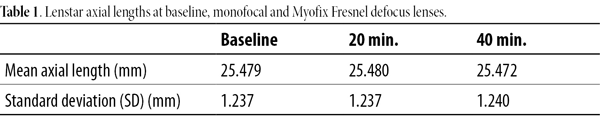 Results: For this study, 16 subjects of both genders (4 females) were tested with Myofix Fresnel lenses. Their mean age was 22.51+/-5.78 years. Their mean spherical equivalent of the right eye was -2.48+/-0.96 diopters. There was a non-significant increase of +1.55 microns in axial length from baseline when reading with the usual prescription (p=0.561). When subjects read in the same situation with Myofix Fresnel defocus spectacles for other 20 minutes, axial length decreased by -8.22 microns (p=0.002).