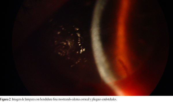 Figura 2. Imagen de lámpara con hendidura fina mostrando edema corneal y pliegues endoteliales.