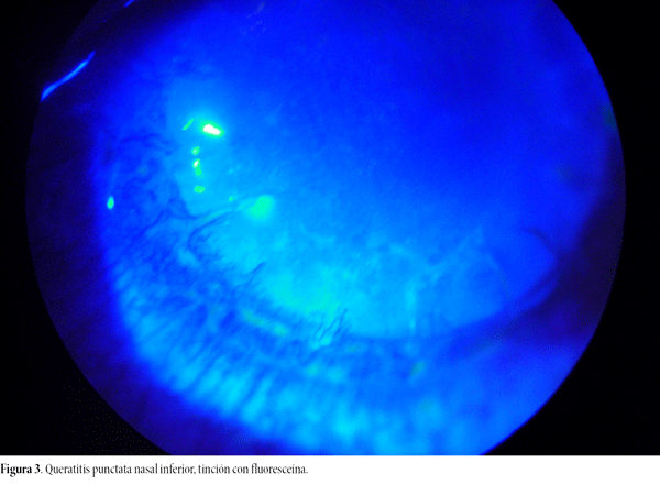 Figura 3. Queratitis punctata nasal inferior, tinción con fluoresceína.