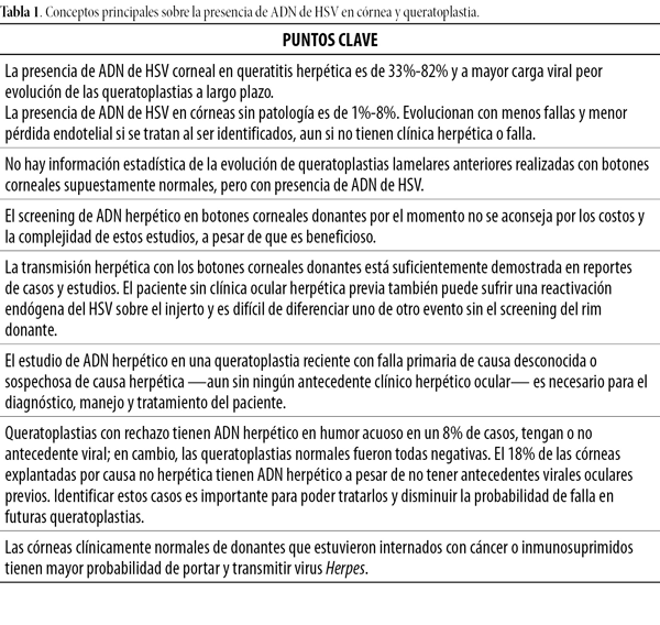 Tabla 1. Conceptos principales sobre la presencia de ADN de HSV en córnea y queratoplastia.