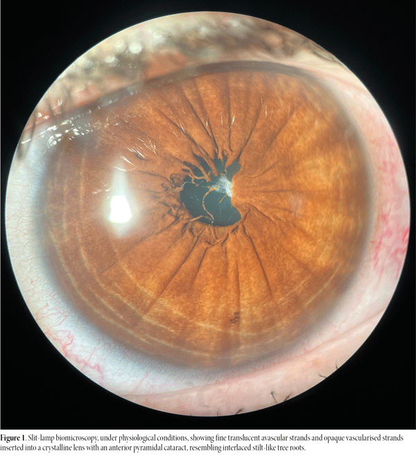Figure 1. Slit-lamp biomicroscopy, under physiological conditions, showing fine translucent avascular strands and opaque vascularised strands inserted into a crystalline lens with an anterior pyramidal cataract, resembling interlaced stilt-like tree roots.