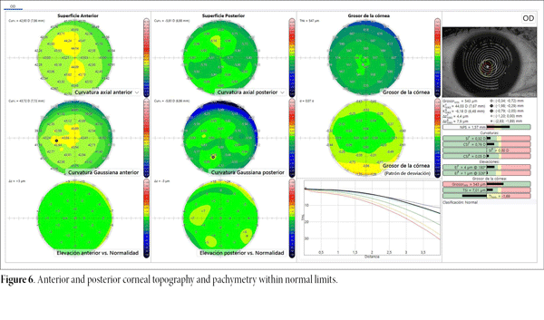 Figure 6. Anterior and posterior corneal topography and pachymetry within normal limits.