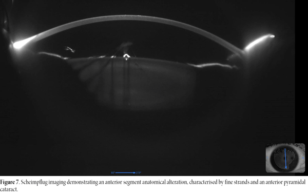 Figure 7. Scheimpflug imaging demonstrating an anterior segment anatomical alteration, characterised by fine strands and an anterior pyramidal cataract.