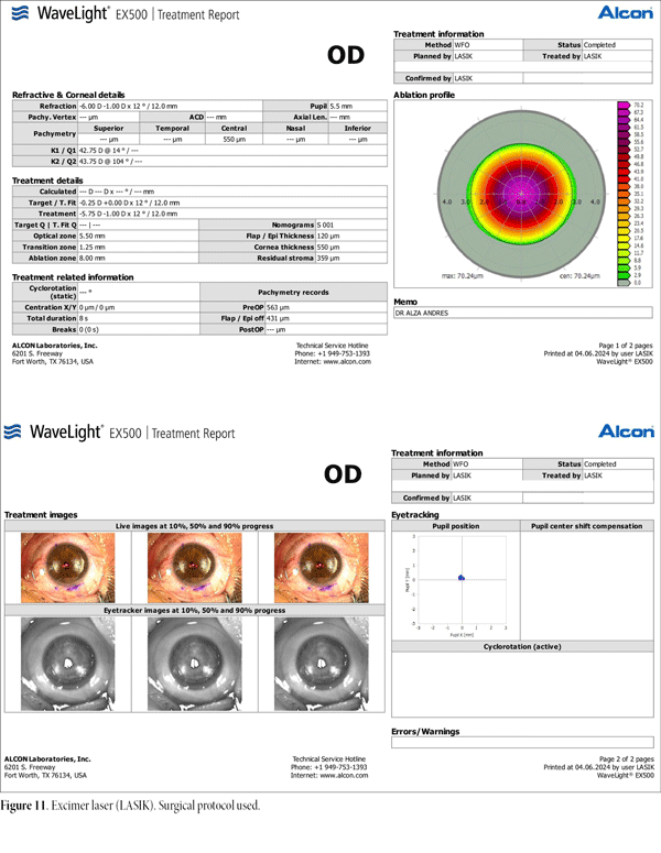 Excimer laser refractive surgery (LASIK, WaveLight® EX500, Alcon) was indicated (Figs. 9-11). The procedure was successful, achieving an uncorrected visual acuity of LogMAR 0.10 at one-year follow-up, with no complications and full patient satisfaction.