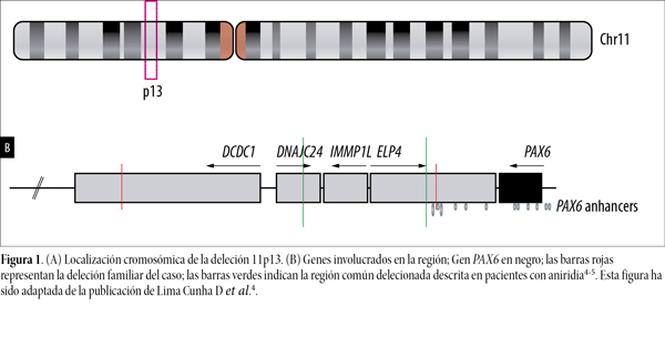 Figura 1. (A) Localización cromosómica de la deleción 11p13. (B) Genes involucrados en la región; Gen PAX6 en negro; las barras rojas representan la deleción familiar del caso; las barras verdes indican la región común delecionada descrita en pacientes con aniridia4-5. Esta figura ha sido adaptada de la publicación de Lima Cunha D et al.4.