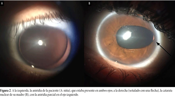 Figura 2. A la izquierda, la aniridia de la paciente (A: niña), que estaba presente en ambos ojos; a la derecha (señalado con una flecha), la catarata nuclear de su madre (B), con la aniridia parcial en el ojo izquierdo.