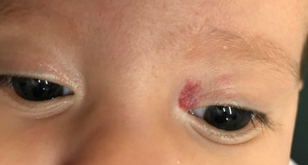 Figura 1. Hemangioma en párpado superior postratamiento de 2 meses con timolol 0,5% con reducción de lesión de canto interno y desaparición de la que se hallaba en tercio medio contigua.