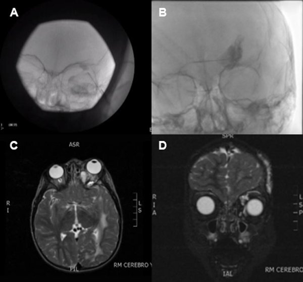 Figura 2. A y B) Escleroterapia con control radiológico realizado. C y D) Resonancia magnética control (corte sagital y coronal respectivamente) de paciente con malformación venolinfática en órbita, párpado superior y región supraciliar. Recibió tratamiento con escleroterapia y retratamiento a los 4 años, asociado a fístula arteriovenosa dural tratada, cavernoma supratentorial, malformación venolinfática microquística en paladar y mejilla izquierda.