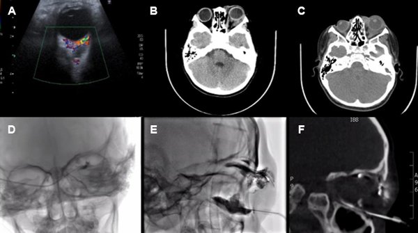 Figura 3. Paciente con malformación linfática orbitaria tratada con esclerosante. Patología asociada: microftalmía, leucoma, atrofia iridiana. A) Ecografía Doppler color, imagen orbitaria. B y C) Tomografía computada en corte sagital. D, E y F) Procedimiento de escleroterapia realizada bajo control radiológico.