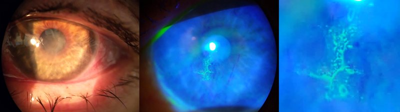 La queratitis por Acanthamoeba se puede presentar como una pseudodendrita, en forma de anillo que simula una queratitis herpética (como se observa en las imágenes del presente artículo), lo que puede retardar el diagnóstico y la instauración de un tratamiento adecuado2.