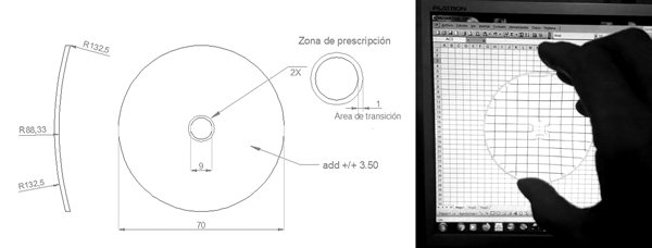 Figure 1. To the left, graphical design of the proposed special spectacles (Rx spherical -3.50 D for distance correction, material index 1.499). The design is feasible in all types of materials, although MR8 resin is recommended for safety and quality. To the right, image of such a lens (-0.50 D central 9mm, +3.00 D periphery) held in front of a rectangular grid.