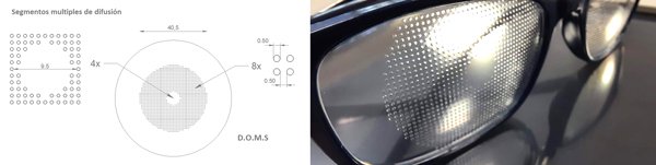 On the other hand, following a different principle of peripheral contrast modulation, spectacle lenses with Bangerter foils in the periphery leaving a central hole for distance vision (8 mm diameter) have been developed by Neitz & Neitz. The company SightGlass vision is in charge of these spectacles of which little information on the mechanism of action, compliance, visual fields and effectiveness are available (Patents US 2011/0313058, WO 2018/026697, US 2020/02717955). Following this idea, instead of a full peripheral foil to decrease contrast, it is here proposed that annular rings of difussion dots are presented in the spectacles with probable benefits in the peripheral visual field vision testing as there is clear vision around the dots. This type of spectacle could be easily developed treating surfaces with lasers at a low cost (Fig. 2). Much has to be done to test progression of myopia in children with these type of spectacles.