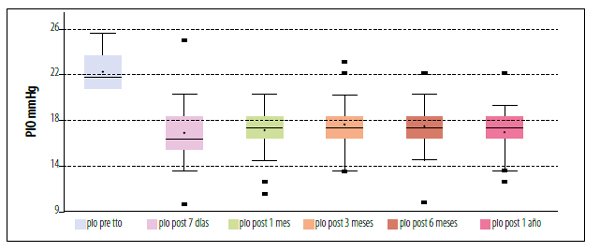 El mayor descenso de la PIO se observó a los siete días posteriores a MDLT. A los tres meses se observó un incremento no significativo en relación a la medición del séptimo día (p=0,08). La PIO tuvo una rápida y significativa disminución que se mantuvo a los doce meses con valores de PIO media 16,48 ± 2,21 (IC 95% 15,64-17,32), lo que significa que hubo una disminución del 26,83% de PIO (fig. 1).