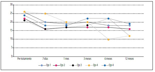 A los doce meses, cinco ojos necesitaron adicionar medicación hipotensora tópica ya que no alcanzaban mantener PIO objetivo (fig. 2).
