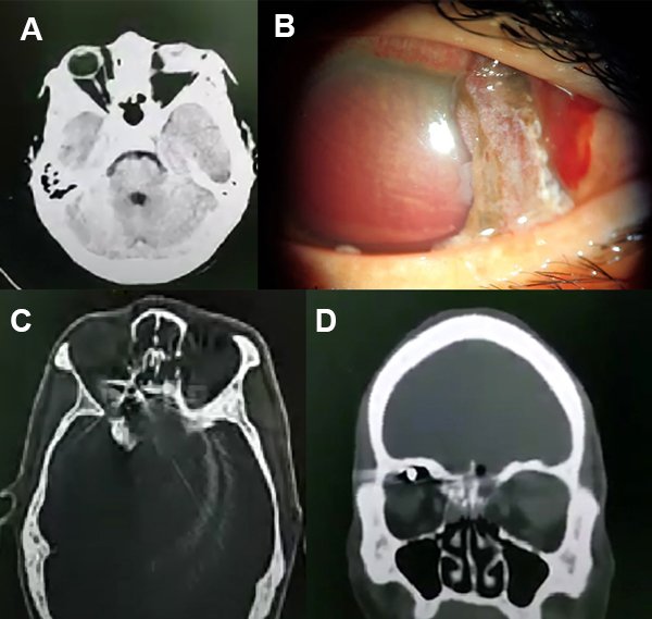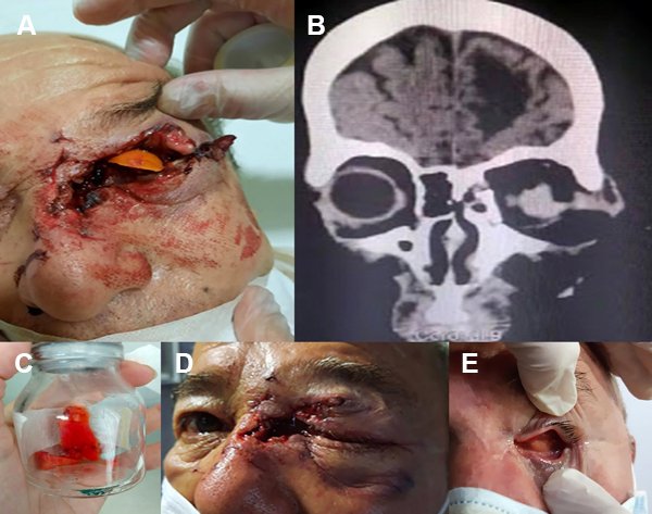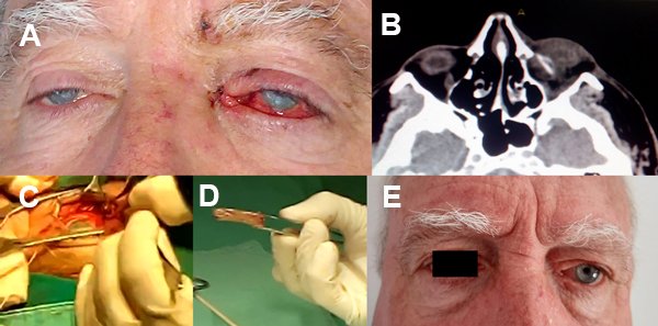 Figura 3. A) Paciente al ingreso. Nótese los CEIOrb múltiples. B) TC corte coronal muestra desorganización de estructuras oculares izquierdas, múltiples imágenes compatibles con CEIOrb, atrofia cerebral senil. C) Fragmentos plásticos extirpados. D) Postoperatorio 24 horas con herida en raíz nasal. E) Paciente 3 meses después: cavidad anoftálmica con buenos fondos de saco.