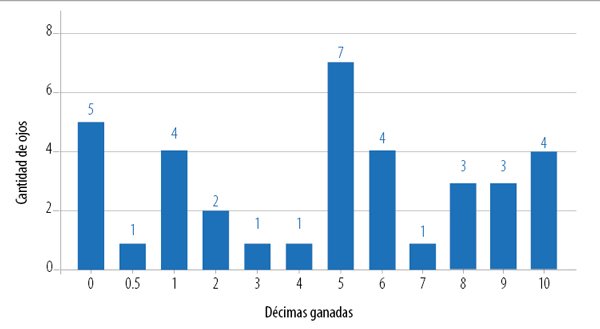 Figura 2. Cambio visual tras realizar tratamiento con vitrectomía 23G más retinopexia láser en 360 grados. Se presenta el número de ojos en relación con el cambio visual (décimas ganadas).