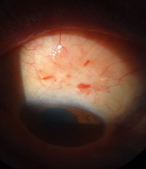 Paciente masculino de 63 años de edad que consultó por irritación y enrojecimiento ocular en ojo izquierdo (OI). Refirió como antecedentes personales: hipertensión arterial e hipotiroidismo en tratamiento. Como antecedentes patológicos oculares expuso cirugía de estrabismo en la infancia y ojo seco sin tratamiento. No indicó antecedentes patológicos familiares de importancia. Al examen oftalmológico presentaba agudeza visual sin corrección, ojo derecho: 20/100, ojo izquierdo: 20/50, se realizó prueba subjetiva: OD esf+3.00; cil -1.00 180°, OI esf +2.25; cil -0.50 16° 20/20 en ambos ojos (AO). En la biomicroscopía (BMC) se evidenciaron párpados, cámara anterior y córnea sin alteraciones en AO, conjuntiva bulbar nasal OI presentaba pterigión grado 2 mínimamente congestivo, presión intraocular 14 mmhg en AO.