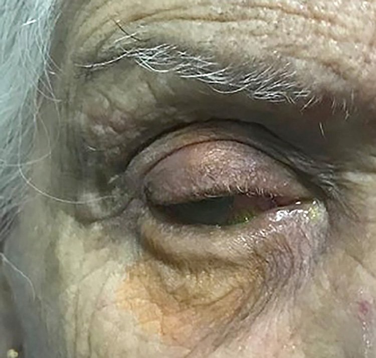 Figure 1. Vesicular lesions in the frontal region that descended to the upper eyelid, Hutchinson’s sign.